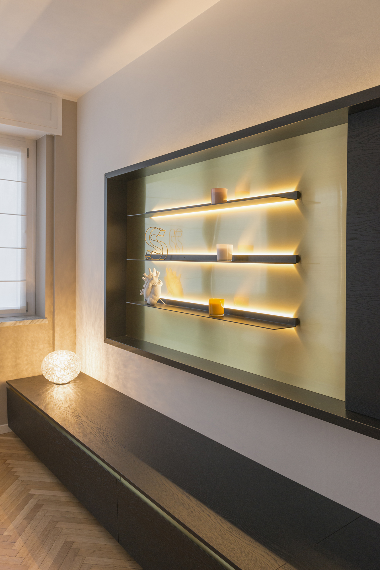 Ristrutturazione completa di un appartamento nel 2020, con arredi su misura e materiali di pregio. Il progetto unisce eleganza e funzionalità, valorizzando gli spazi con soluzioni personalizzate. Finiture di alta qualità e dettagli artigianali creano un ambiente raffinato e accogliente.